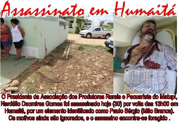 HUMAITÁ (AM) - O fazendeiro e presidente da Associação dos produtores de Matupí, Nardélio Deomires Gomes de 47 anos foi assassinado agora pouco (13h00) em Humaitá nas proximidades do Restaurante Tia Moçinha, com dois tiros a queima roupa, sendo que o primeiro atingiu a vítima de raspão nas mãos e pescoço, e o outro perfurou seu coração ocasionando morte instantânea. A polícia foi acionada até o local mais ao chegar nada pode ser feito, pois o criminoso evadiu-se em uma motocicleta preta modelo BROZ da Honda, a placa não foi identificada. Santo Antônio do Matupi é uma localidade do sul do estado que cresceu bastante nos últimos anos, os moradores daquela região tinham voz e representação através de Nardélio Gomes, fazendeiro e defensor dos interesses da comunidade até então. A notícia do assassinato desta liderança comunitária chegou com surpresa neste dia, uma vez que o produtor e fazendeiro era uma das pessoas que mais reivindicava melhorias para o Matupí que é distrito do município de Manicoré, porém situado as margens da BR 230 conhecida como “Transamazônica”, Nardélio tinha bastante trânsito político ao governo do estado e demais autoridades amazonenses, que era uma espécie de procurador e defensor dos moradores de Matupí. COMO ACONTECEU O CRIME Segundo testemunhas no local, Nardélio acabara de chegar ao restaurante “Tia Moçinha” para almoçar, quando de repente chegou um homem de aparência clara procurando pelo fazendeiro, este por sua vez reconheceu o rapaz que o procurava e saiu alguns metros do restaurante para conversar com Paulo Sérgio conhecido como “Mão Branca” Nardélio conversou cerca de três minutos, em seguida as testemunhas observaram que a conversa partiu para um discussão severa que finalizou com Paulo Sérgio disparando dois tiros em Nardélio ocasionando a morte do mesmo em poucos minutos. Em seguida Paulo Sergio pegou sua motocicleta e partiu em rumo ignorado, após assassinar o fazendeiro. Suposto Motivo do Assassinato Nardélio era um homem de grandes posses e reconhecido como um liderança de respeito em sua comunidade, ela anualmente por ser o presidente da Associação dos Produtores Rurais e Pecuaristas do Matupí (ASPROMAT) organizava a Festa Agropecuária do lugar, e como um dos principais incentivadores local, contratou os serviços do carpinteiro Paulo Sérgio para realização de reparos na arena Parque de Exposições Amadeu Rodrigues Vidal no distrito de Santo Antônio do Matupí (km 180). Testemunhas afirmam que Paulo Sergio, alegava que, Nardélio Gomes não havia cumprido o acordo trabalhista corretamente, e que em face ao descumprimento do pagamento corretamente havia denunciado o fazendeiro no Ministério do Trabalho em Humaitá, a audiência de conciliação aconteceu hoje (30), porém não houve acordo, e foi remarcado novo encontro entre as partes no mês de janeiro de 2012. Testemunhas acreditam que este possa ser o motivo do desentendimento, uma vez que, o relacionamento de Nardélio Gomes era tranqüilo com demais pessoas de sua comunidade. O Matupí perde uma grande liderança no dia de hoje, (30) Nardélio Gomes, além de ser fazendeiro e produtor, era respeitado no meio político como defensor dos interesses de sua comunidade, que recentemente esteve reunido em Manaus com o governador Omar Aziz (PSD) para tratar assuntos de interesses da comunidade do Matupí, inclusive com diversas pessoas importantes do local reivindicando, mais recursos e oportunidades junto ao governo do estado. A reunião teve como objetivo discutir um conjunto de medidas para aumentar a presença do Estado na área, que vem enfrentando conflitos sociais, ambientais e legais, decorrentes da explosão demográfica e ocupação irregular. Omar Aziz reconheceu que Santo Antônio do Matupi é uma comunidade grande, com problemas ambientais sérios, como a exploração ilegal de madeira e de minérios, mas que é possível intensificar a atuação do Estado em conjunto com órgãos federais. Até o fechamento da matéria o criminoso não havia sido capturado pela polícia, maiores informações a qualquer momento aqui no seu canal de informação. (Foto) Fonte: Acritica de Humaitá | ||